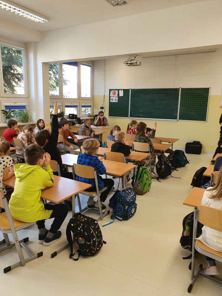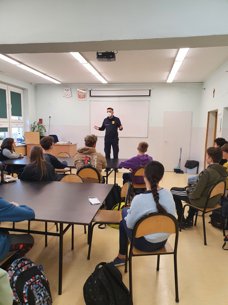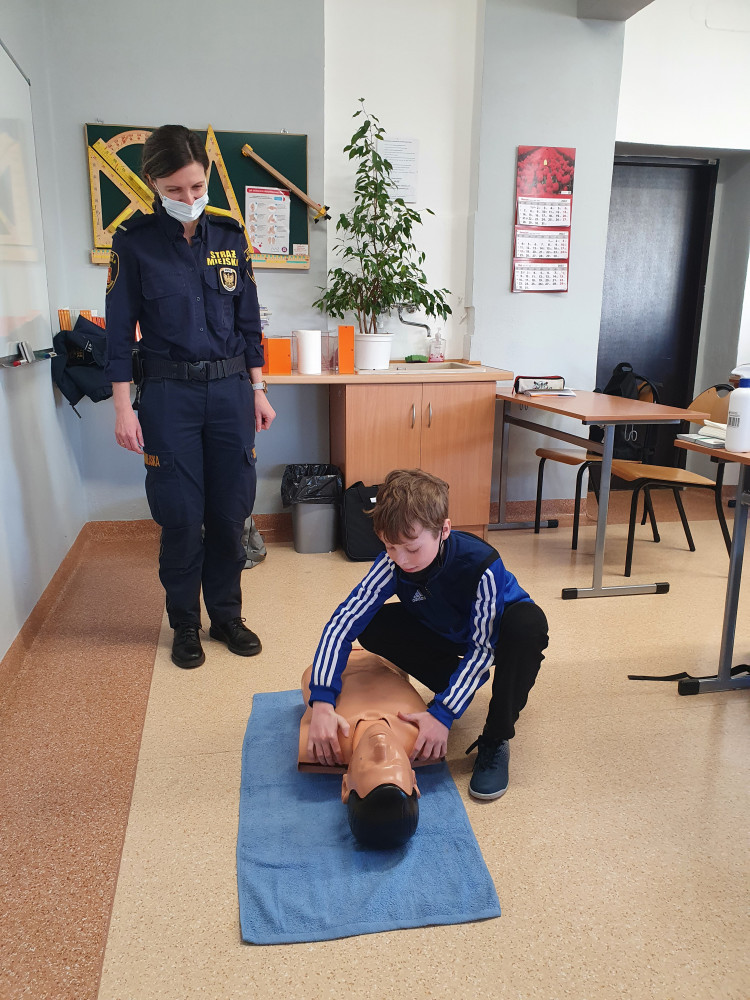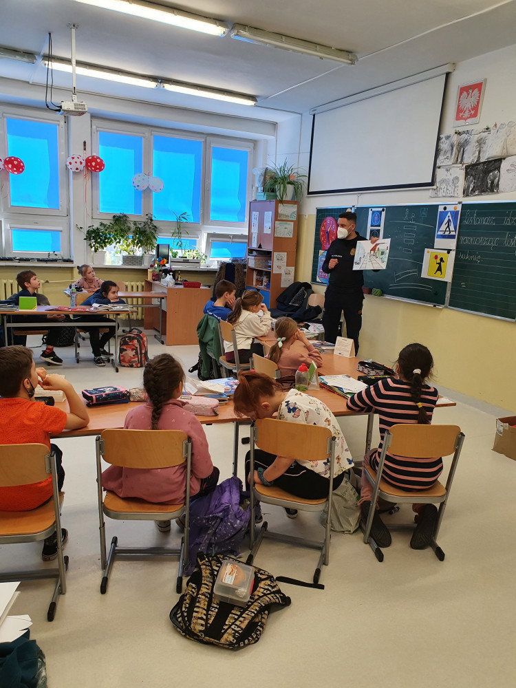 Bezpieczeństwo w domu i na placu zabaw były przewodnim tematem zajęć w oddziale przedszkolnym. Nasi najmłodsi uczniowie z dużym zainteresowaniem obejrzeli też mundur strażnika miejskiego, naszywki i odznakę. Uczniowie klas drugich nauczyli się, jak wezwać pomoc, gdy znajdą się w niebezpieczeństwie, jak bezpiecznie dotrzeć do szkoły i jak zareagować na spotkanie z nieznajomym. Nasze dzieci to także przyjaciele zwierząt. Trzecioklasiści wiedzą już, że zwierzę to nie zabawka, a troska o nie wymaga odpowiedzialności. Panie przypomniały, jak odpowiedzialnie traktować czworonożnych przyjaciół i dbać przy tym o własne bezpieczeństwo. Siódmoklasistom nie jest już obca pierwsza pomoc przedmedyczna. Wiedzą, jak poradzić sobie w trudnej sytuacji, jak pomóc osobom z najbliższego otoczenia w sytuacjach nagłego zagrożenia życia i zdrowia, w jaki sposób wezwać odpowiednie służby. Najstarsi uczniowie wysłuchali wykładu na temat odpowiedzialności prawnej. Poznali podstawowe zagadnienia zawarte w ustawie o postępowaniu w sprawach nieletnich, takie jak: nieletni, czyny karalne, czyny świadczące o demoralizacji. Podczas zajęć zdobyli też wiedzę z zakresu metod bezpiecznego zachowania się, zagrożeń występujących we współczesnym świecie oraz sposobów ich unikania bądź zminimalizowania negatywnych skutków.