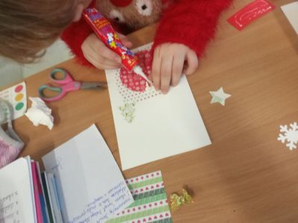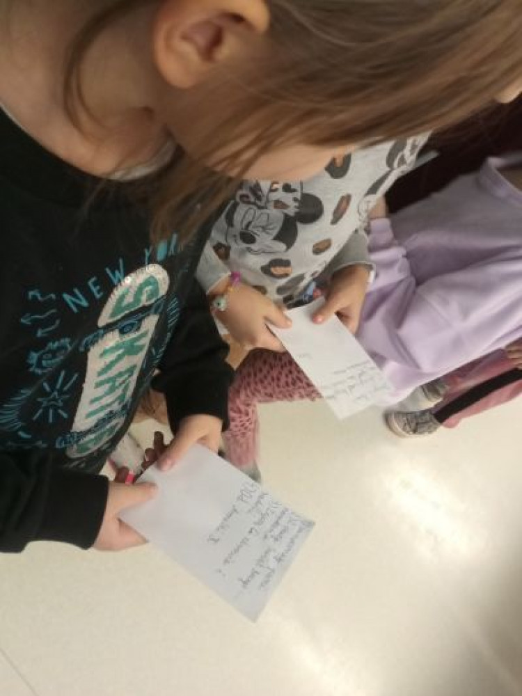 W ramach projektu edukacyjnego "Szlachetnie i zdrowo z małpką Iwoną" uczniowie kl. 2c wykonali kartki świąteczne dla seniorów. Dzieci odczytały list od małpki Iwony, w którym przypomniała, aby pamiętali o starszych i szanowali ich.