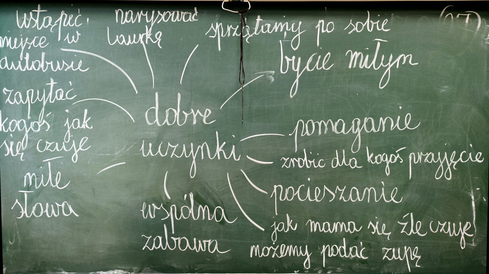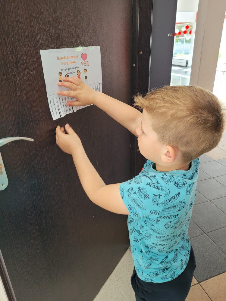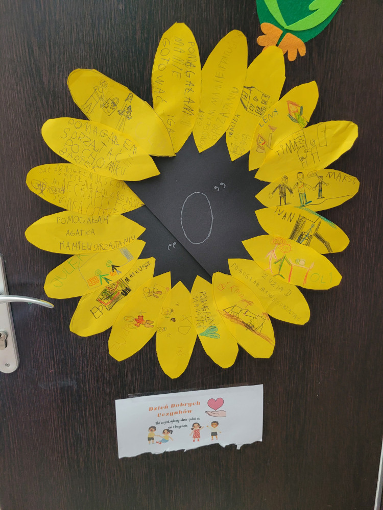19 maja w naszej szkole zorganizowaliśmy Dzień Dobrych Uczynków. Uczniowie mieli okazję porozmawiać o tym, czym są dobre uczynki i przypomnieli sobie, jak niewiele potrzeba, aby sprawić komuś radość oraz jak ważna jest pomoc i wsparcie drugiej osoby. Na korytarzach zawisły kartki motywujące do wykonania drobnej, dobrej rzeczy lub powiedzenia miłego słowa. Powstały też kwiaty symbolizujące dobre uczynki. Byłoby wspaniale, gdyby Dzień Dobrych Uczynków trwał cały rok.