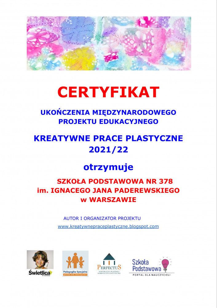 Od października 2021 roku uczniowie klasy 3c uczęszczający na zajęcia logopedyczne wzięli udział w Międzynarodowym Projekcie Edukacyjnym „Kreatywne Prace Plastyczne”. W trakcie roku szkolnego uczniowie mogli zaspokoić naturalną potrzebę aktywności plastycznej poprzez eksperymentowanie z różnymi materiałami i technikami plastycznymi. Proponowane działania przyczyniły się do rozwijania sprawności motorycznej, pozwalały na polisensoryczne poznawanie świata i stwarzały okazję do budowania wiary we własne możliwości. Stanowiły też doskonałą okazję do rozwijania mowy, wzbogacania słownika oraz utrwalania głosek ćwiczonych w terapii. Udział w projekcie był ciekawym doświadczeniem i przyczynił się do wszechstronnego rozwoju uczniów biorących w nim udział.