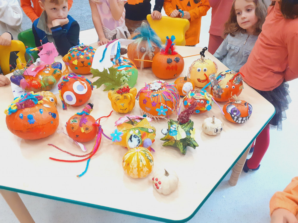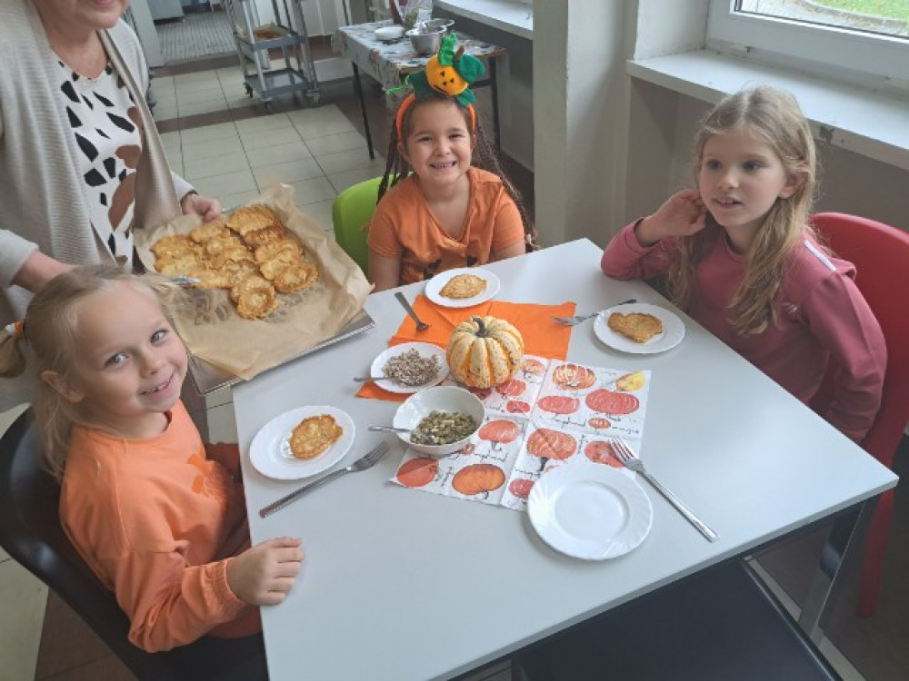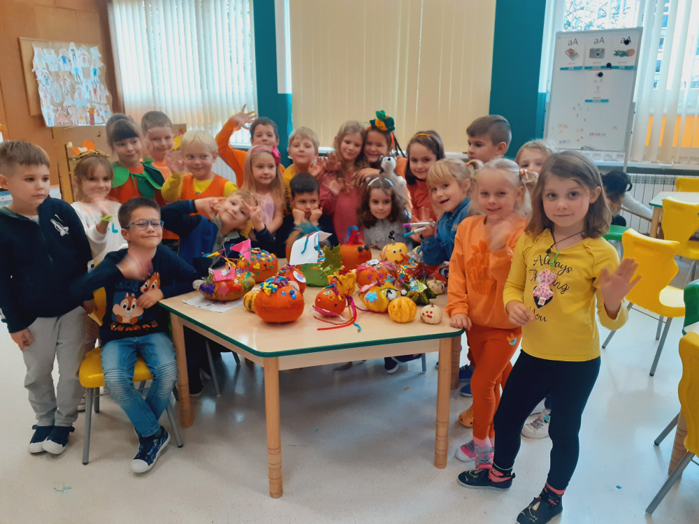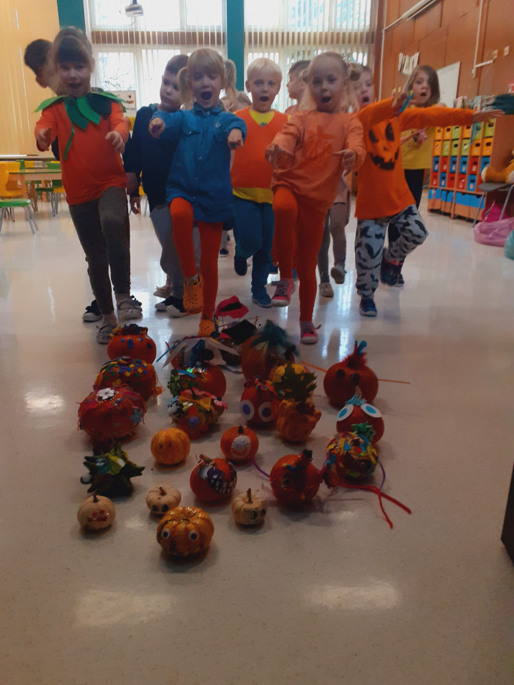 Gdy nadchodzi koniec jesiennych zbiorów, czas ogłosić Dzień Dyni. W oddziale przedszkolnym święto to obchodziliśmy 26 października. Dzieci ubrały się na pomarańczowo – można było poczuć się jak na dyniowej grządce. Podczas zajęć wzbogaciły wiedzę na temat dyń. Dowiedziały się, że dynia jest bardzo zdrowym owocem, można z niej przygotować wiele dań, m. in.: pieczywo, zupę, dżem, ciasto, babeczki, przetwory i soki. Odbyły się też dyniowe zabawy: klasyfikowanie dyń według wielkości, koloru i kształtu, szeregowanie od największej do najmniejszej, przeliczanie i zabawy słowotwórcze. Najwięcej emocji wywołało samodzielne dekorowanie owocu. Mali artyści z zapałem zabrali się do pracy i powstały piękne dynie - każda inna, każda wyjątkowa. Na zakończenie wszyscy delektowali się dyniowymi plackami przygotowanymi przez panie kucharki, a dekorowanymi przez dzieci.