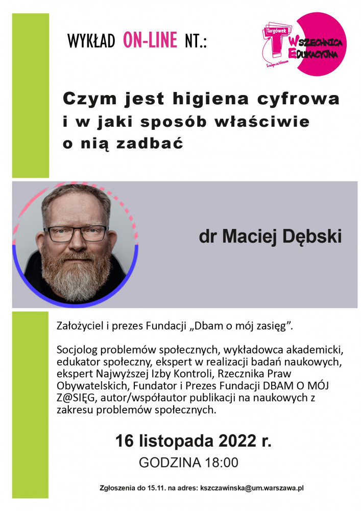 Serdecznie zapraszamy na wykład on-line Wszechnicy Edukacyjnej Targówek nt. „Czym jest higiena cyfrowa i w jaki sposób właściwie o nią zadbać” – 16 listopada br. o godz. 18:00.