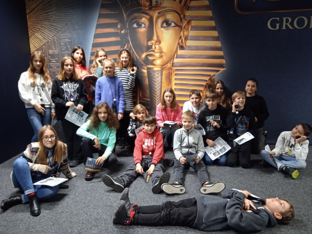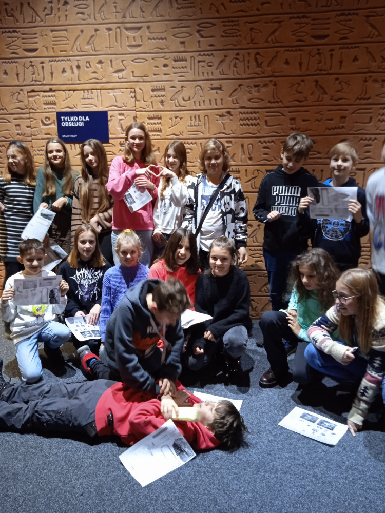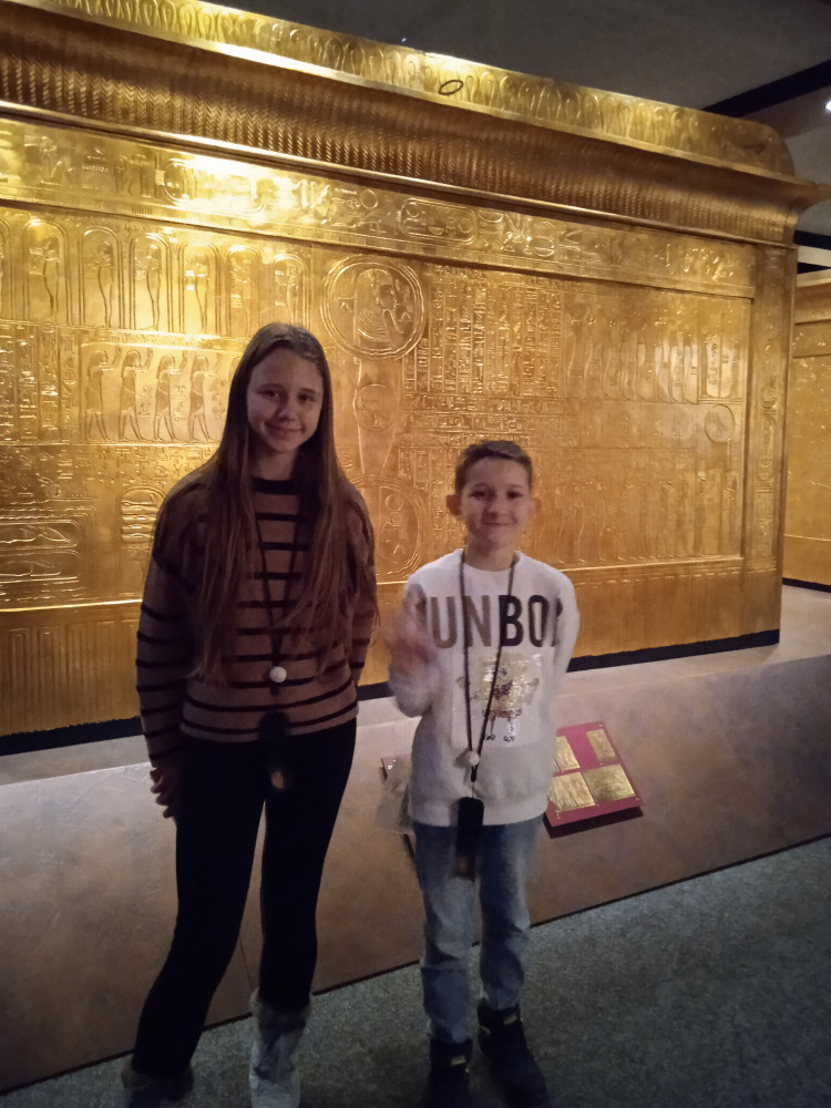Uczniowie klasy 5b odbyli niezwykłą podróż w czasie. Dzięki wystawie Tutanchamon. Grobowiec i jego skarby przenieśli się do starożytnego Egiptu. Wraz z odkrywcą Howardem Carterem przebyli drogę do ukrytego grobowca młodego władcy Tutanchamona. Niestrudzony badacz po wielu miesiącach archeologicznych poszukiwań w 1922r. odkrył w Dolinie Królów nienaruszone przez rabusiów miejsce pochówku faraona. Zrobiona z wielkim rozmachem wystawa pozwoliła zobaczyć to, co sto lat temu ujrzał Howard Carter. Zakopane głęboko schody do przedsionka pełnego starożytnych przedmiotów, sale, z których jedna była właściwym grobowcem, złote ściany kolejnych kaplic pokryte hieroglifami, setki przedmiotów codziennego użytku od rydwanu, przez fotele, szkatułki, kosztowności, modele statków, aż po mumię faraona. Wszystko to zobaczyli piątoklasiści podczas cudownej podróży w czasie i niezwykłej lekcji historii w Muzeum Nowa Praga.