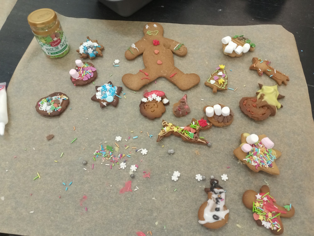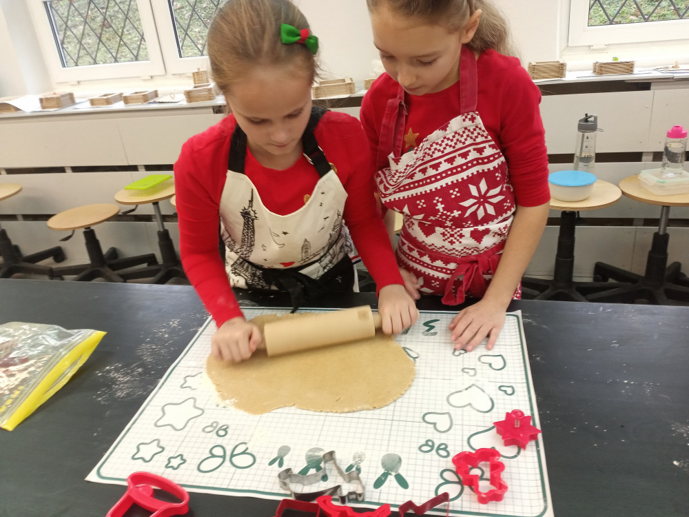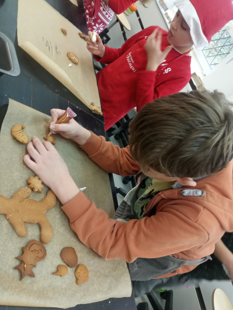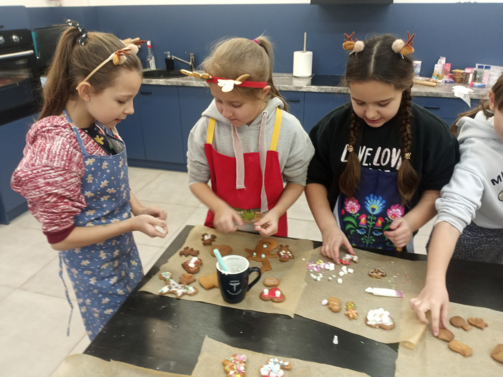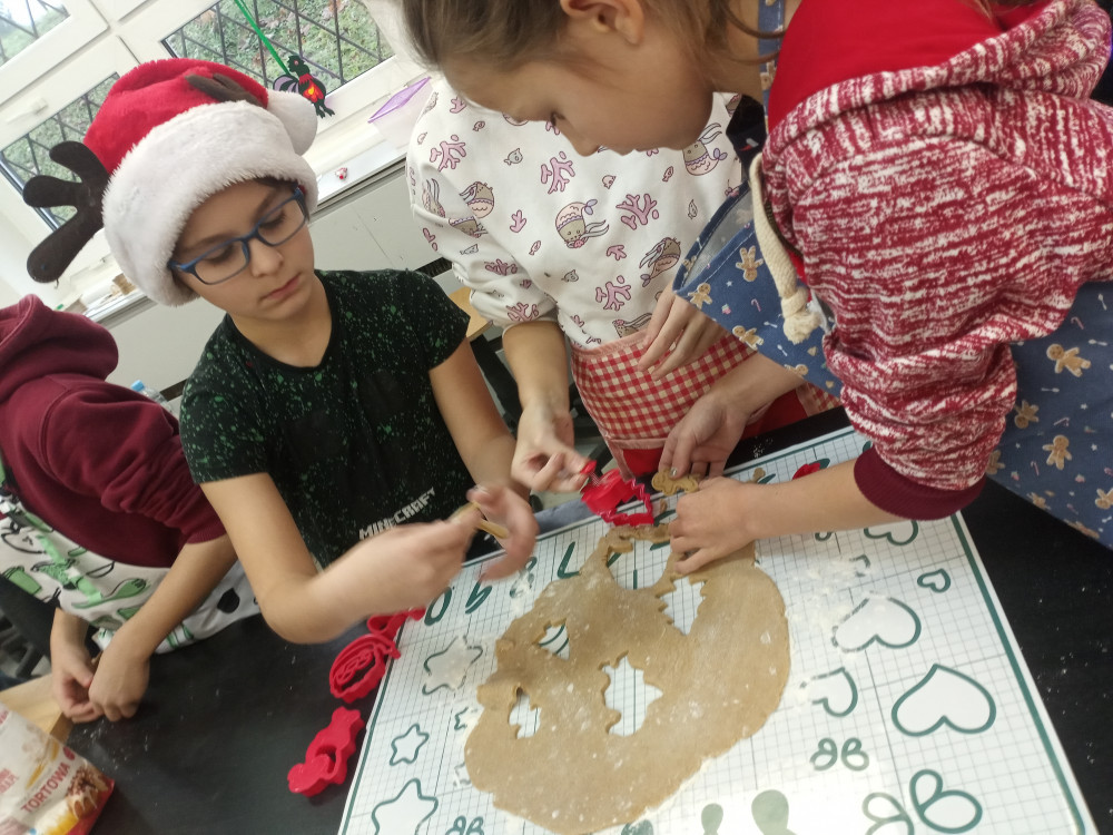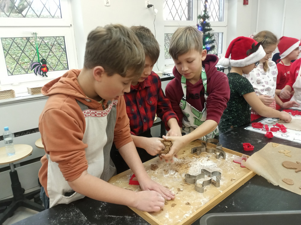 W ubiegły piątek w całej szkole rozchodził się przepiękny zapach pieczonych pierników. Zawdzięczaliśmy ten cudowny aromat klasie 3c, która uczestniczyła w warsztatach piernikarskich zorganizowanych w ramach mikołajkowego upominku. Każdy uczeń otrzymał przepis, składniki i niezbędne przybory do przygotowania świątecznych ciasteczek. Następnie samodzielnie przygotował ciasto, gniotąc i wałkując, a korzystając z foremek, nadał im ostateczny kształt. Po upieczeniu dekorował pierniki według własnego pomysłu. To był wspaniały prezent, który nie tylko smakował, ale nauczył samodzielnego wypieku. Bardzo dziękujemy za pomoc pani Katarzynie Filip, która koordynowała przebieg pracy młodych cukierników.