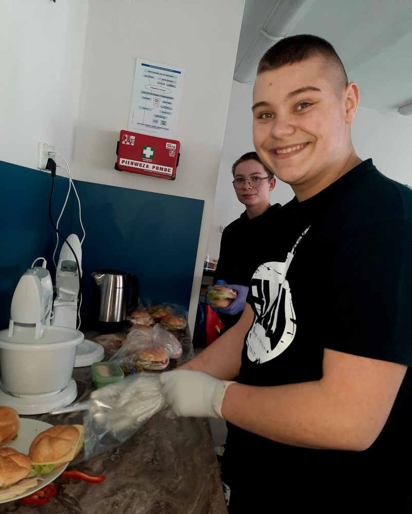 19 grudnia uczniowie klasy 4c i wolontariusze z kl. 8a wraz z panią Anną Czeczotko oraz nauczycielem muzyki panem Maciejem Madalińskim przygotowywali kanapki dla osób dotkniętych problemem bezdomności przebywających na Dworcu Centralnym w Warszawie. Sto pięćdziesiąt pysznych i pożywnych kanapek trafiło do potrzebujących!