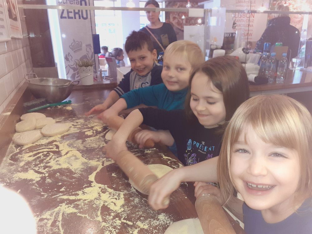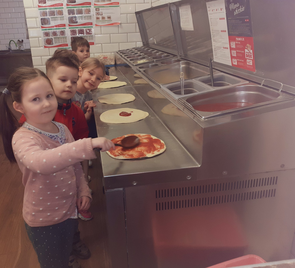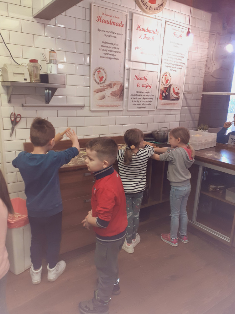 ze wspólnego przygotowywania posiłków oraz biesiadowanie w restauracji. Starszaki przygotowały ciasto, z zapałem wałkowały je, ubijały i rozciągały. Smakowały sos i składniki, którymi dekorowały pizzę. Miały okazję obejrzeć pracę kucharza w profesjonalnej kuchni, poznały atrybuty tego zawodu. Dowiedziały się, że najważniejszym zadaniem w gotowaniu jest dbanie o zdrowe składniki żywieniowe oraz o higienę. Przekonały się, że samodzielnie wykonane potrawy smakują znacznie lepiej.