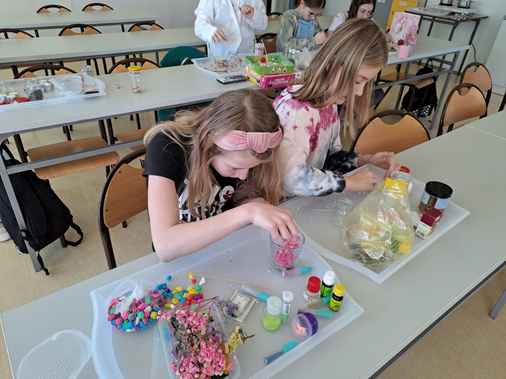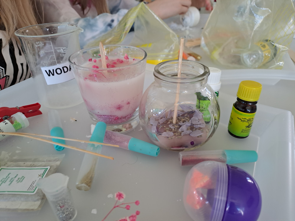 W ubiegłą sobotę pracownia chemiczna wypełniła się aromatycznymi zapachami olejków, kawy, suszonych kwiatów, esencji spożywczych, przypraw i perfum. To wszystko za sprawą odbywających się tam zajęć koła przyrodniczego. Uczestnicy poznali właściwości wosku i zasady jego topnienia, rodzaje knotów oraz rozkład temperatury w płomieniu świecy. Własnoręcznie wykonywali świece z oryginalnych, zgromadzonych przez siebie suszonych kwiatów z własną kombinacją naturalnych zapachów i barwników. Małe i duże świece w szklanych naczyniach o wyjątkowych kształtach staną się doskonałym prezentem oraz unikatową dekoracją pokoju.