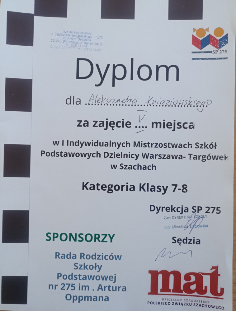w Szachach zorganizowanych przez Szkołę Podstawową nr 275. Serdecznie gratulujemy!