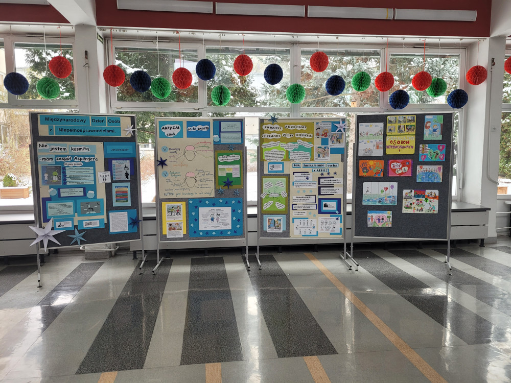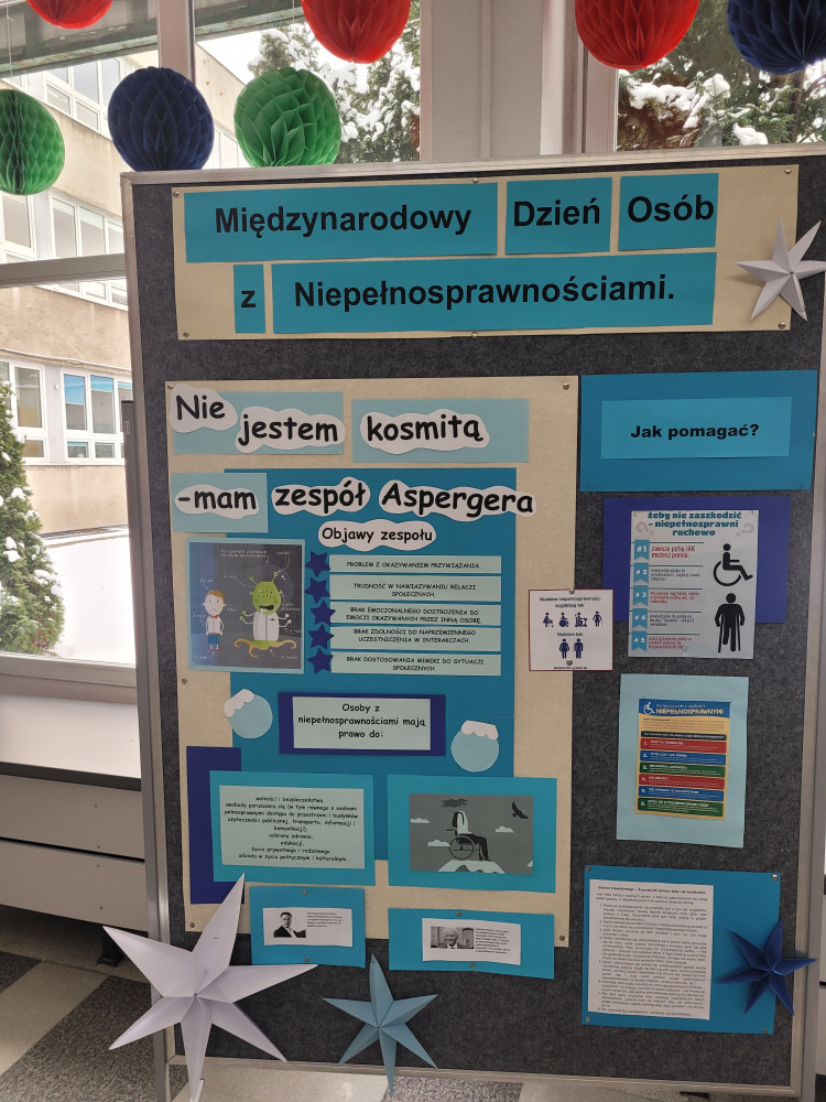 4 grudnia obchodziliśmy w szkole Międzynarodowy Dzień Osób z Niepełnosprawnościami. Uczniowie i nauczyciele ubrali się na biało na znak solidarności z osobami, które borykają się z różnymi rodzajami niepełnosprawności. Na forum ustawiliśmy tablice z informacjami na temat poszczególnych niepełnosprawności, by młodzież mogła dowiedzieć się, jak prawidłowo budować relacje oraz zapewnić osobom z ograniczeniami bezpieczeństwo i stworzyć płaszczyznę do wspólnego funkcjonowania. Na forum zaprezentowane też zostały prace konkursowe przygotowane z tej okazji przez uczniów.