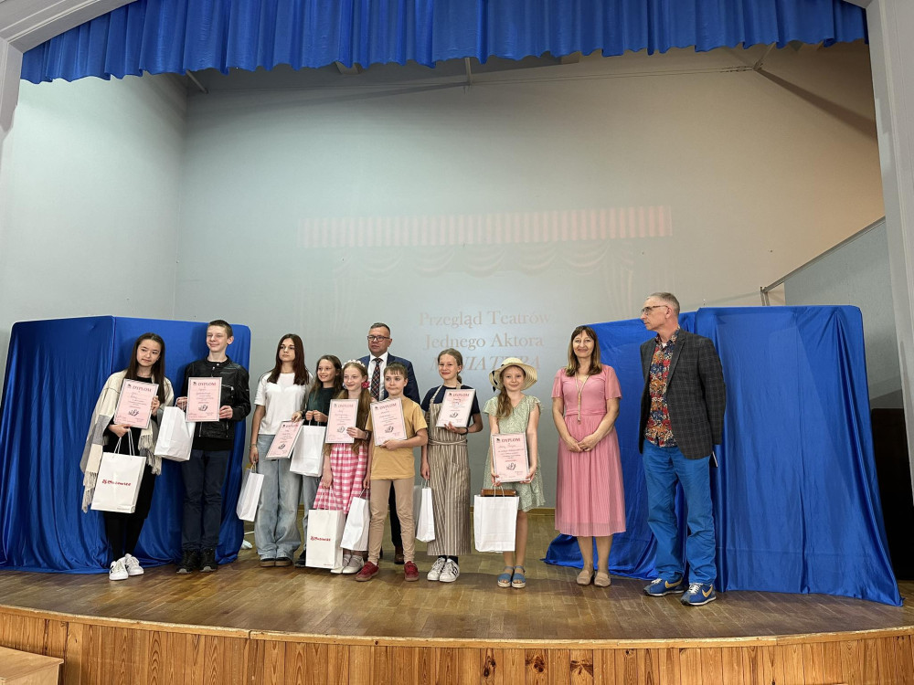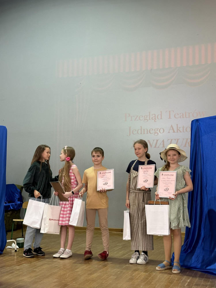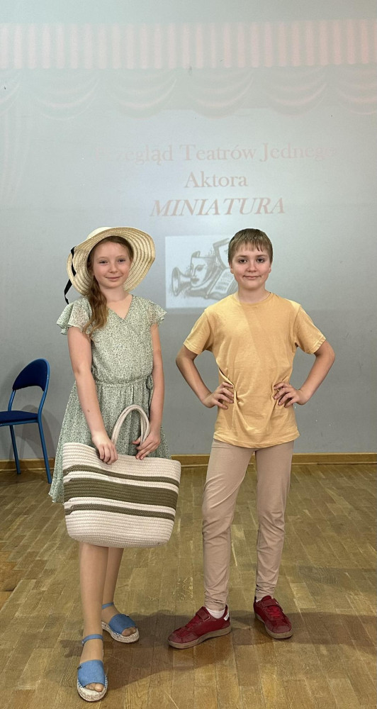 23 maja w Szkole Podstawowej nr 85 im. Benito Juareza w Warszawie odbył się Przegląd Teatrów Jednego Aktora Miniatura 2024. Honorowy patronat nad wydarzeniem objął Burmistrz Dzielnicy Mokotów m. st. Warszawy oraz Ośrodek Rozwoju Polskiej Edukacji za Granicą. Uczestniczyło w nim dwoje naszych uczniów z klasy 4c. Z dumą informujemy, iż Mieszkowi Fideckiemu za interpretację „Pamiętników Adama i Ewy” M. Twaina przyznano 2. miejsce w kategorii wiekowej klas 4-6, zaś Anna Targoni, która zaprezentowała fragment powieści L. M. Montgomery „Ania z Zielonego Wzgórza”, otrzymała nagrodę specjalną ufundowaną przez Dyrektora Szkoły Podstawowej im. Benito Juareza p. Mariusza Wychódzkiego za oryginalny wyraz artystyczny. To już drugie wyróżnienie dla tej dwójki w bieżącym roku szkolnym. Niedawno odbierali nagrody indywidualne podczas przeglądu teatralnego „Maska”. Zdaje się, że rosną aktorskie talenty. Gratulujemy i życzymy kolejnych sukcesów!