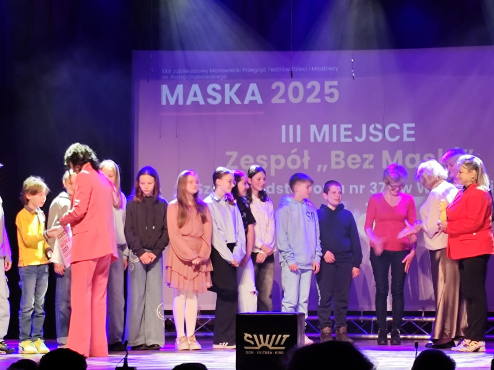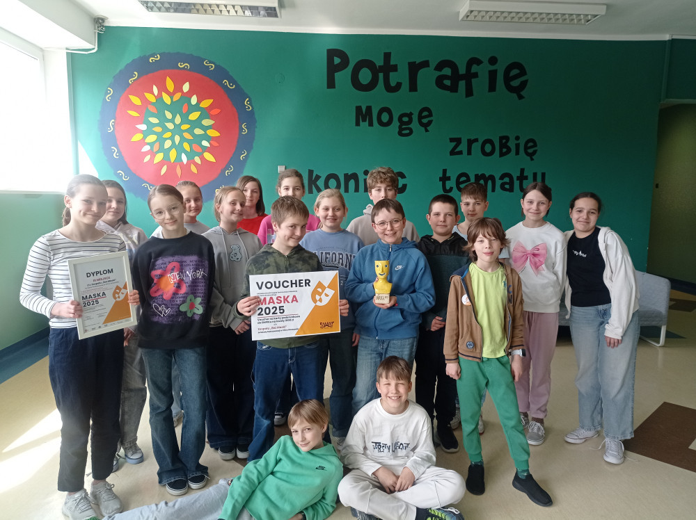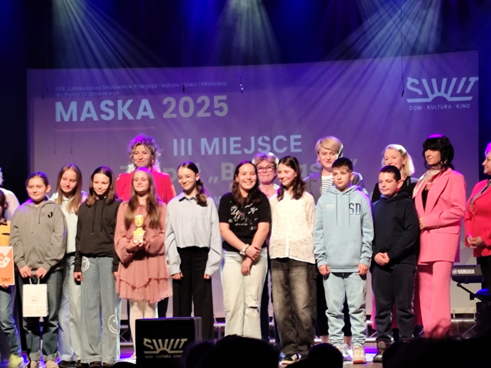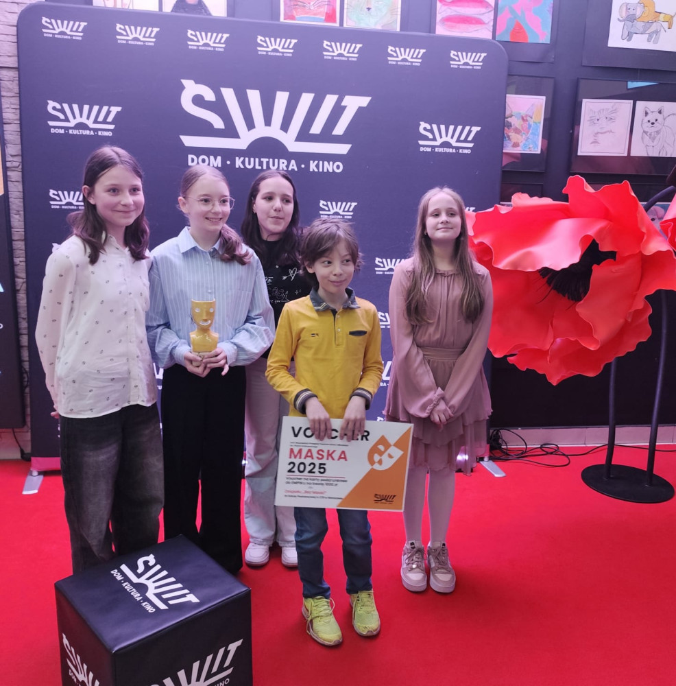 Uczniowie klasy 5c z rodzicami i wychowawczynią spędzili miły wieczór 28 marca 2025 w Domu Kultury Świt. Odbyła się tam uroczysta gala jubileuszowego XXX Przeglądu Teatrów Dzieci i Młodzieży im. Piotra Grabowskiego MASKA 2025. Z dumą informujemy, że nasza grupa teatralna "Bez Maski" odebrała statuetkę, dyplom i nagrody za zajęcie 3. miejsca w kategorii dzieci starsze kl. 5-8. Poziom tegorocznych przedstawień był bardzo wysoki, tym bardziej cieszy nas zajęcie miejsca na podium. Serdecznie gratulujemy wszystkim nagrodzonym grupom teatralnym, a organizatorom dziękujemy za zaproszenie i wspaniałą uroczystość!