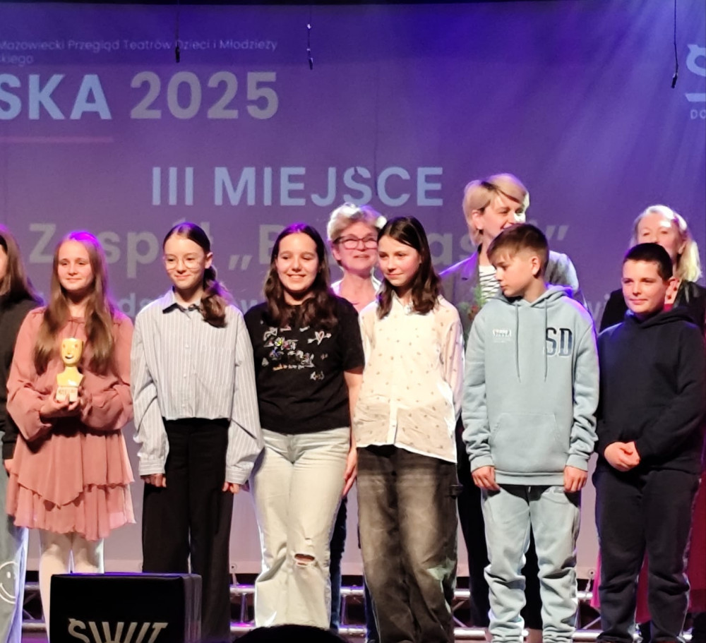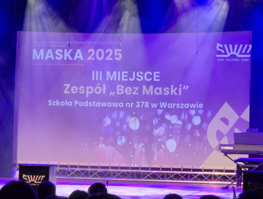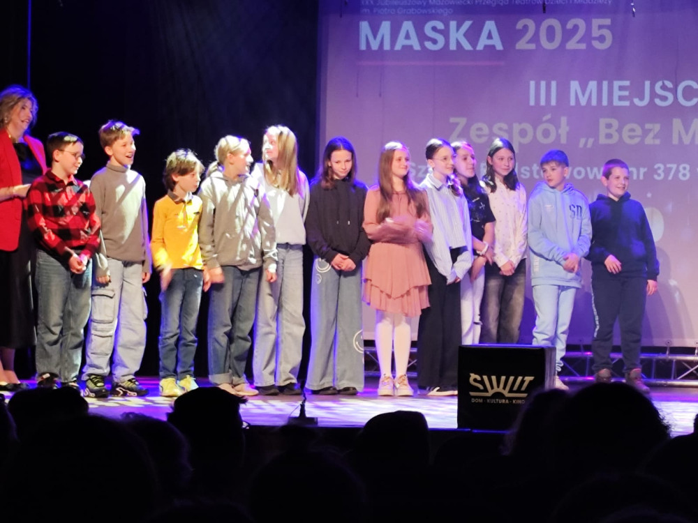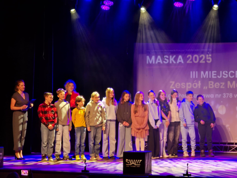 Uczniowie klasy 5c z rodzicami i wychowawczynią spędzili miły wieczór 28 marca 2025 w Domu Kultury Świt. Odbyła się tam uroczysta gala jubileuszowego XXX Przeglądu Teatrów Dzieci i Młodzieży im. Piotra Grabowskiego MASKA 2025. Z dumą informujemy, że nasza grupa teatralna "Bez Maski" odebrała statuetkę, dyplom i nagrody za zajęcie 3. miejsca w kategorii dzieci starsze kl. 5-8. Poziom tegorocznych przedstawień był bardzo wysoki, tym bardziej cieszy nas zajęcie miejsca na podium. Serdecznie gratulujemy wszystkim nagrodzonym grupom teatralnym, a organizatorom dziękujemy za zaproszenie i wspaniałą uroczystość!