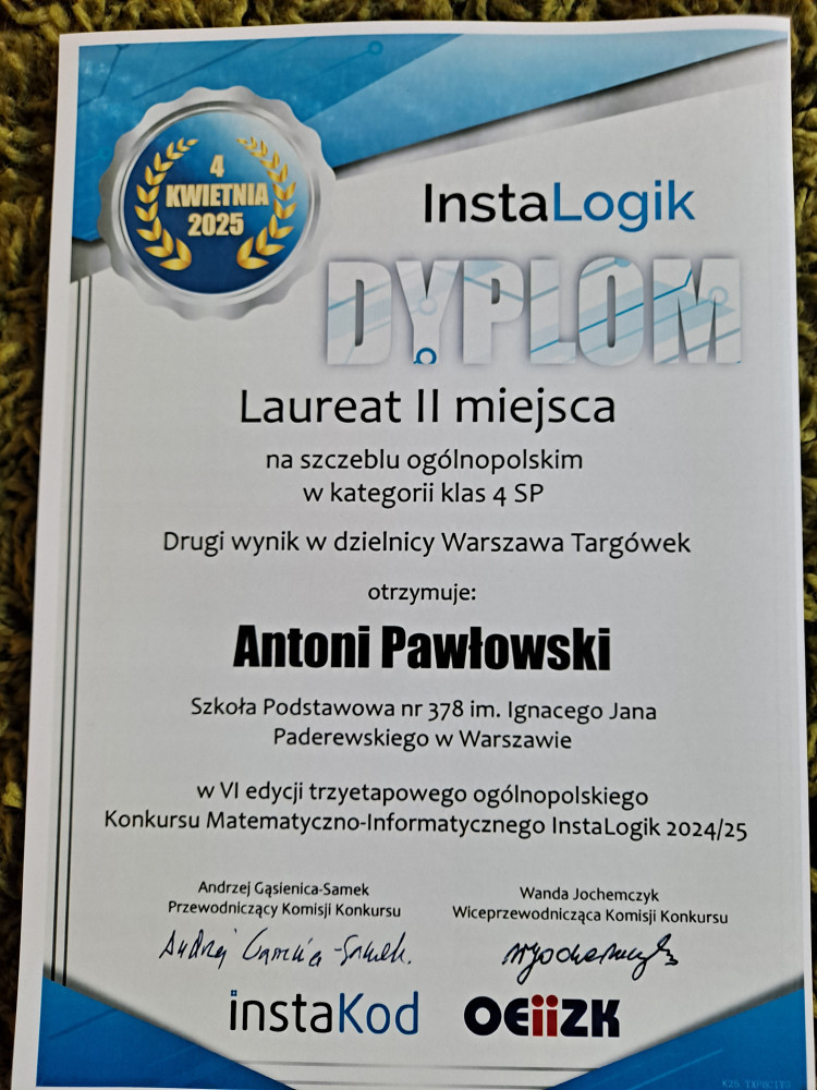 Mamy przyjemność poinformować, że uczeń naszej szkoły, Antoni Pawłowski z klasy 3b, wziął udział w VI edycji konkursu InstaLogik 2024/2025 i został laureatem II miejsca. To drugi wynik w dzielnicy Warszawa Targówek.