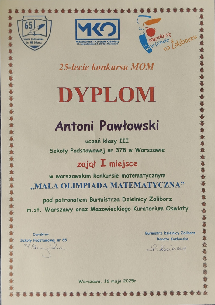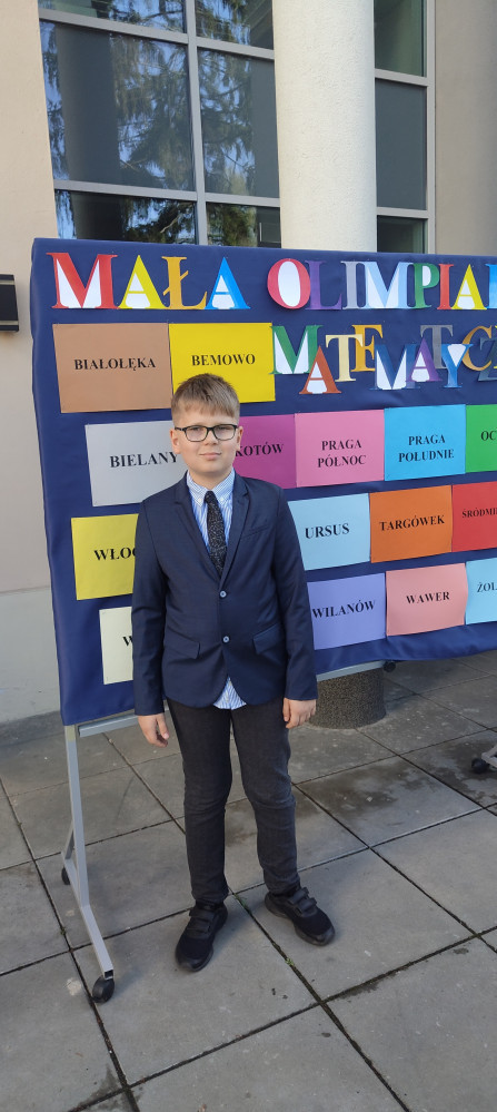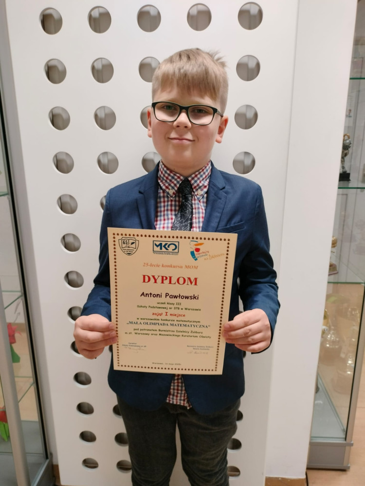 Uczeń klasy 3b, Antoni Pawłowski, zajął I miejsce w warszawskim konkursie matematycznym "Mała Olimpiada Matematyczna". Wykazał się wyjątkowymi umiejętnościami logicznego myślenia, precyzją w rozwiązywaniu zadań oraz głęboką wiedzą z zakresu matematyki. Gratulujemy sukcesu i życzymy dalszych osiągnięć!