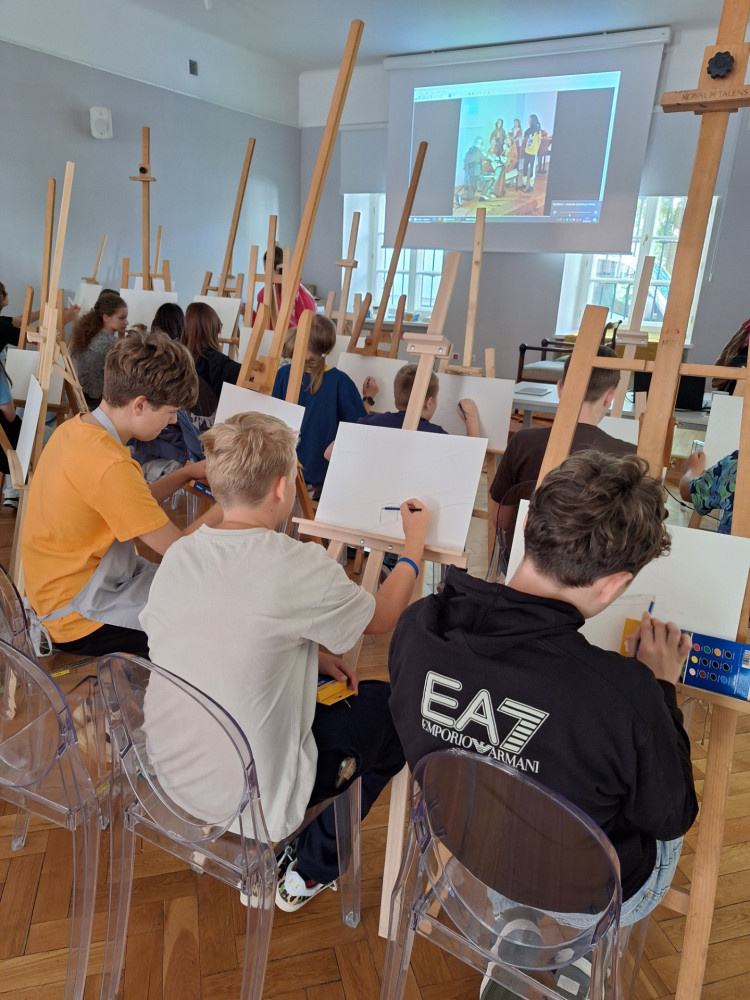 22 września klasa 6a uczestniczyła w lekcji w Instytucie Sztuki Polskiej Akademii Nauk, podczas której uczniowie pogłębili wiedzę o obrazach historycznych Jana Matejki oraz jego metodach pracy. Dowiedzieli się również, skąd malarz czerpał inspiracje, jak zdobywał informacje na temat wydarzeń historycznych i jak wyglądały dawne stroje. W drugiej części spotkania odbyły się warsztaty plastyczne, podczas których uczestnicy malowali scenę hołdu pruskiego.