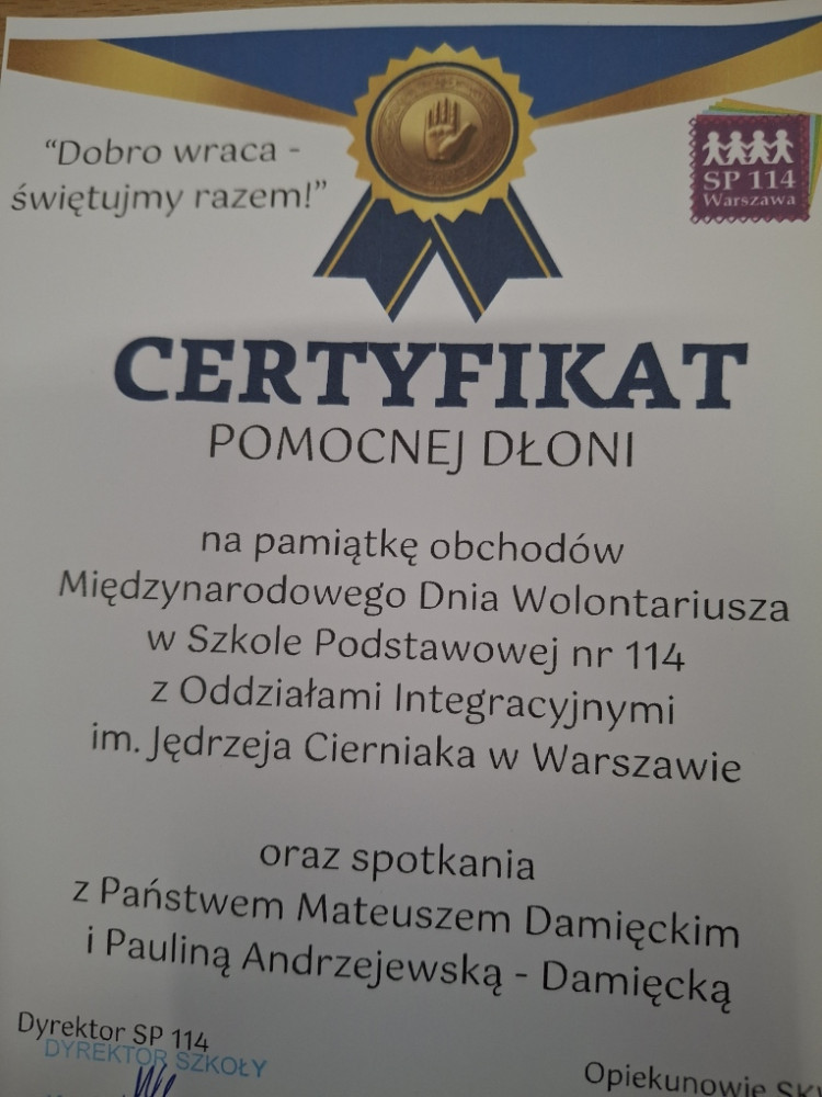 4 listopada w Szkole Podstawowej nr 114 odbyło się spotkanie z okazji obchodów Międzynarodowego Dnia Wolontariusza pod hasłem ,, Dobro wraca - świętujmy razem".