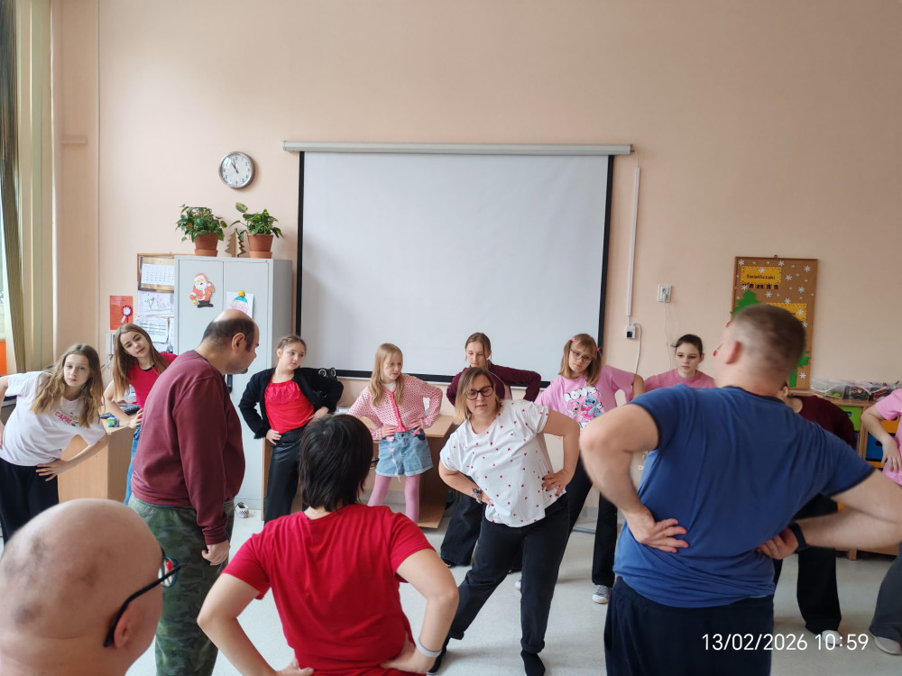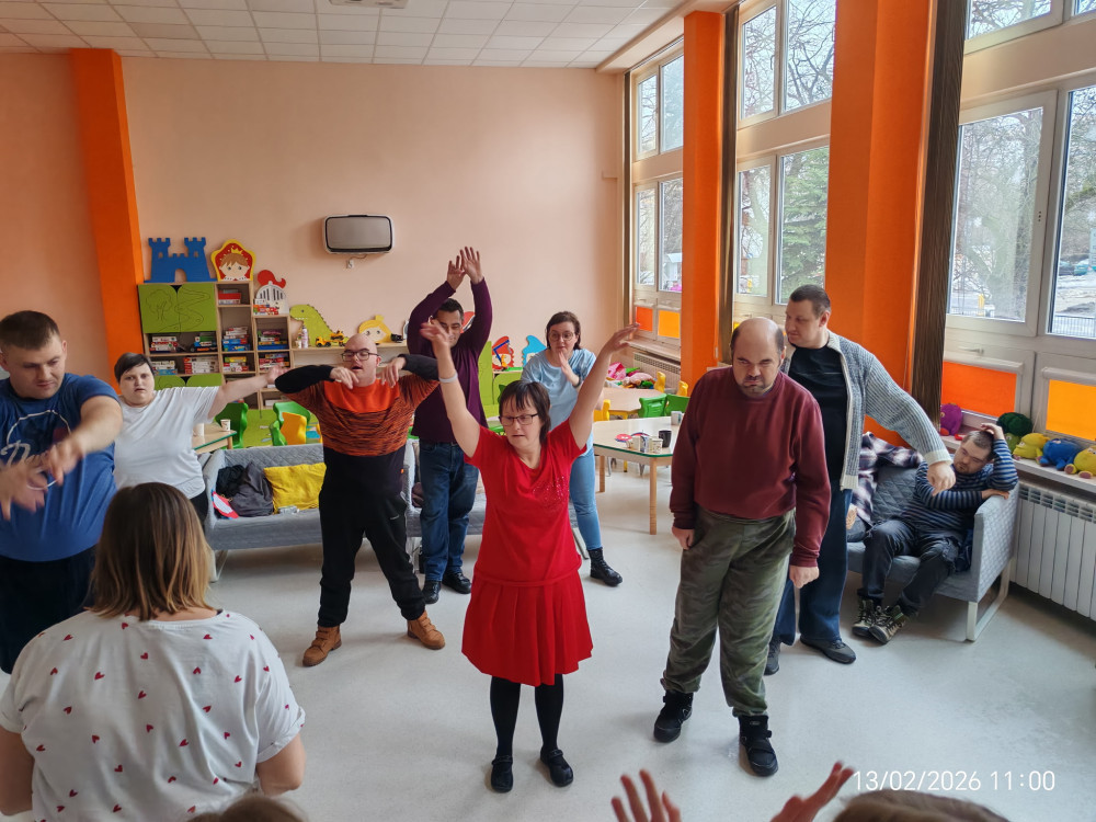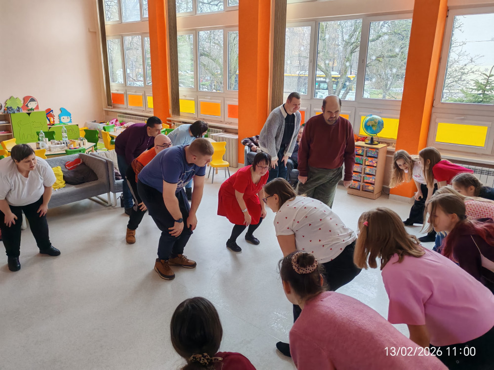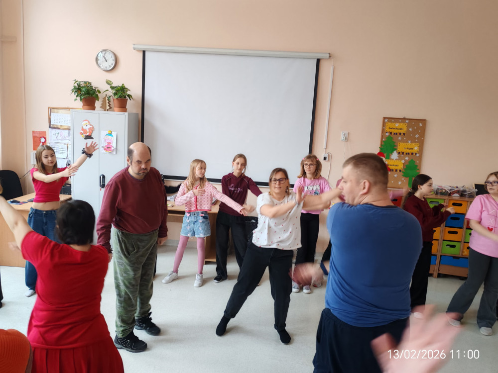 Zaproszeni goście oraz wolontariusze z naszej szkoły z entuzjazmem uczestniczyli we wspólnych zajęciach ruchowych. Pod okiem prowadzących uczyli się prostych układów tanecznych, ćwiczyli poczucie rytmu oraz koordynację ruchową. Nie zabrakło elementów tańców integracyjnych i zabaw przy muzyce, które porwały wszystkich do wspólnej aktywności.