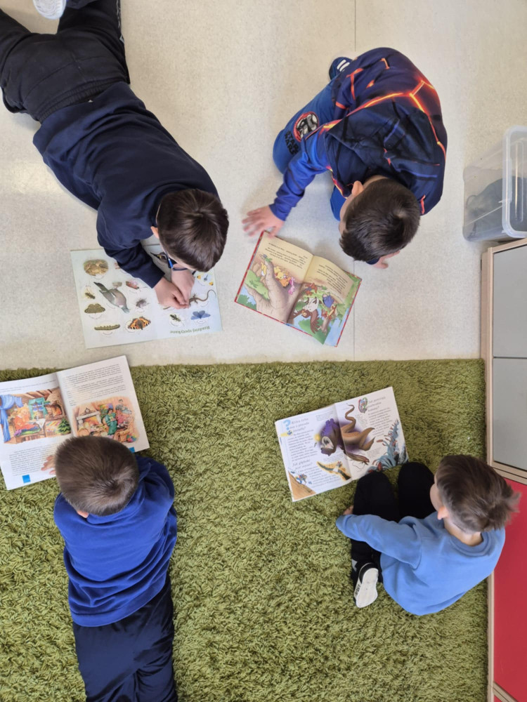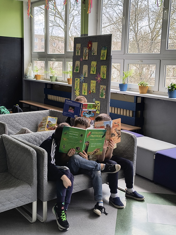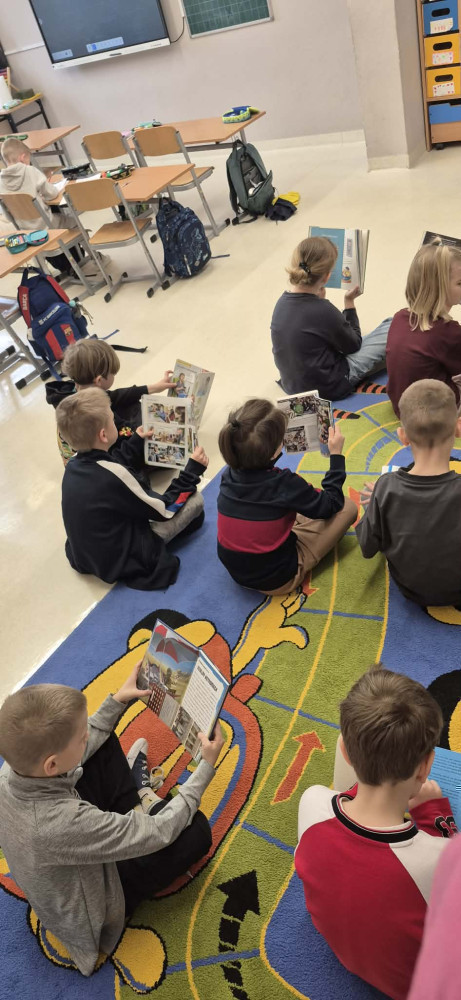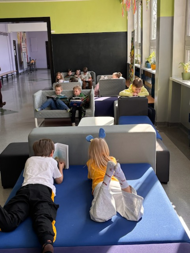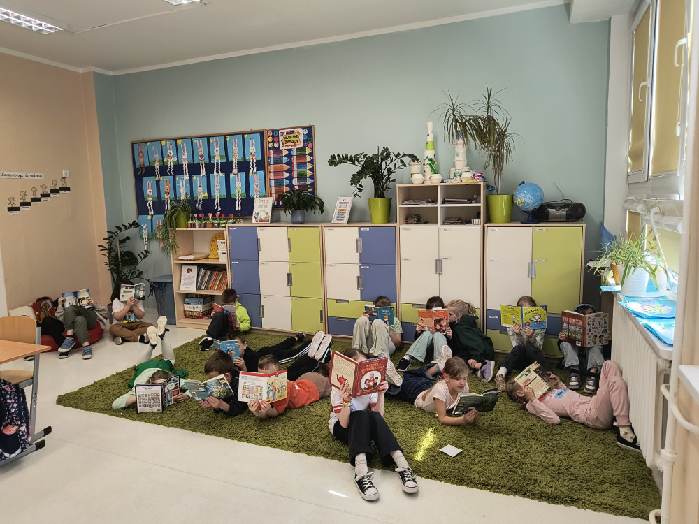 Uczniowie klas pierwszych w każdy piątek uczestniczą w wyjątkowym czasie czytelniczym- podczas jednej z lekcji sięgają po książki i spędzają czas na czytaniu. To spokojny moment w tygodniu, który sprzyja rozwijaniu wyobraźni, koncentracji oraz budowaniu nawyku czytania. Dzieci mogą czytać w takiej pozycji, w jakiej jest im najwygodniej- leżąc na dywanie, siedząc na pufie czy na kanapie. Książki uczniowie wybierają samodzielnie: mogą sięgnąć po tytuły z klasowej biblioteczki, przynieść z domu własną książkę albo wypożyczyć ją ze szkolnej biblioteki. Każdy wybiera to, co najbardziej go interesuje- od bajek po ciekawe opowiadania, wiersze i książki przyrodnicze. Na zakończenie lekcji uczniowie dzielą się tym, co ich zaciekawiło, opowiadają o przeczytanych fragmentach i polecają swoje książki kolegom i koleżankom. Regularne spotkania z książką pomagają rozwijać umiejętność czytania, wzbogacają słownictwo i przede wszystkim pokazują, że czytanie może być prawdziwą przyjemnością.